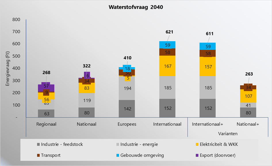 Omdat binnen de scenario’s bepaalde elementen nog ontbraken, hebben we twee varianten toegevoegd (een variant op het scenario Nationaal waar de industrie zeer sterk inzet op elektrificatie en een variant op het scenario Internationaal waar ook 38,5 GW wind op zee wordt gerealiseerd ten behoeve van meer productie groene waterstof), waardoor er uiteindelijk met zes 2040 energiescenario’s gerekend is.