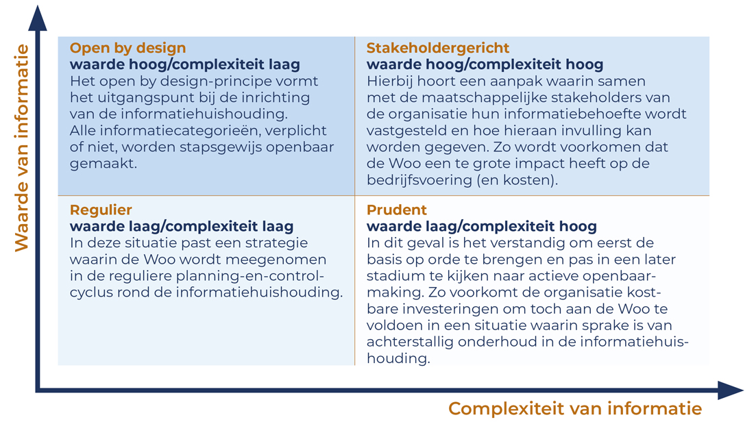 Wanneer de waarde en complexiteit van de informatie in de organisatie inzichtelijk zijn, is het mogelijk uitspraken te doen over de impact van de invoering van de Woo en daar vervolgens een invoeringsstrategie voor te bepalen. De volgende matrix beschrijft hoe waarde en complexiteit zich verhouden tot een invoeringsstrategie: