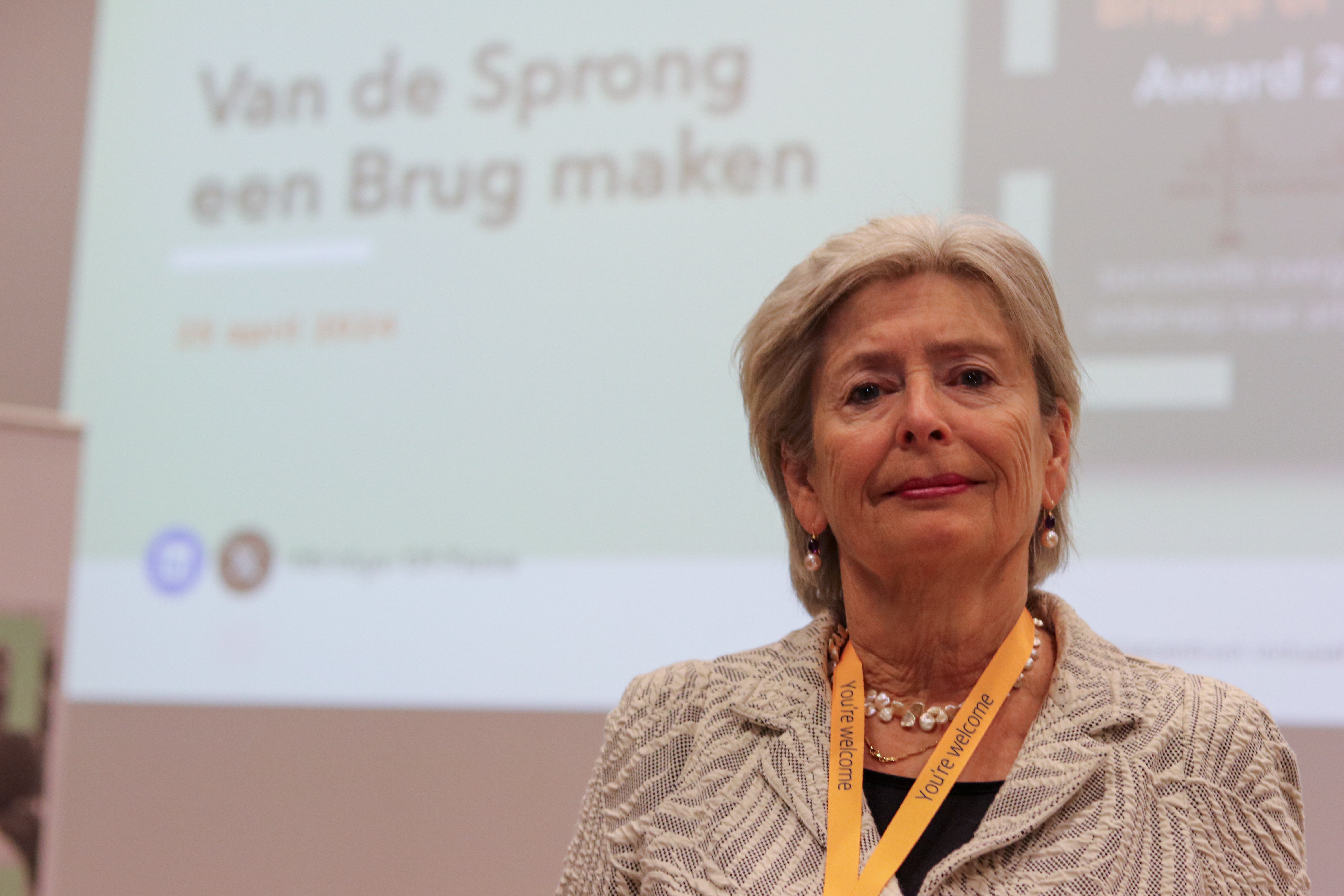Twee van de juryleden Piroska Masthoff en Luc Damen. De jury prijst de inspanningen die de onderwijsinstellingen leveren om van de ‘Sprong een Brug’ te maken.