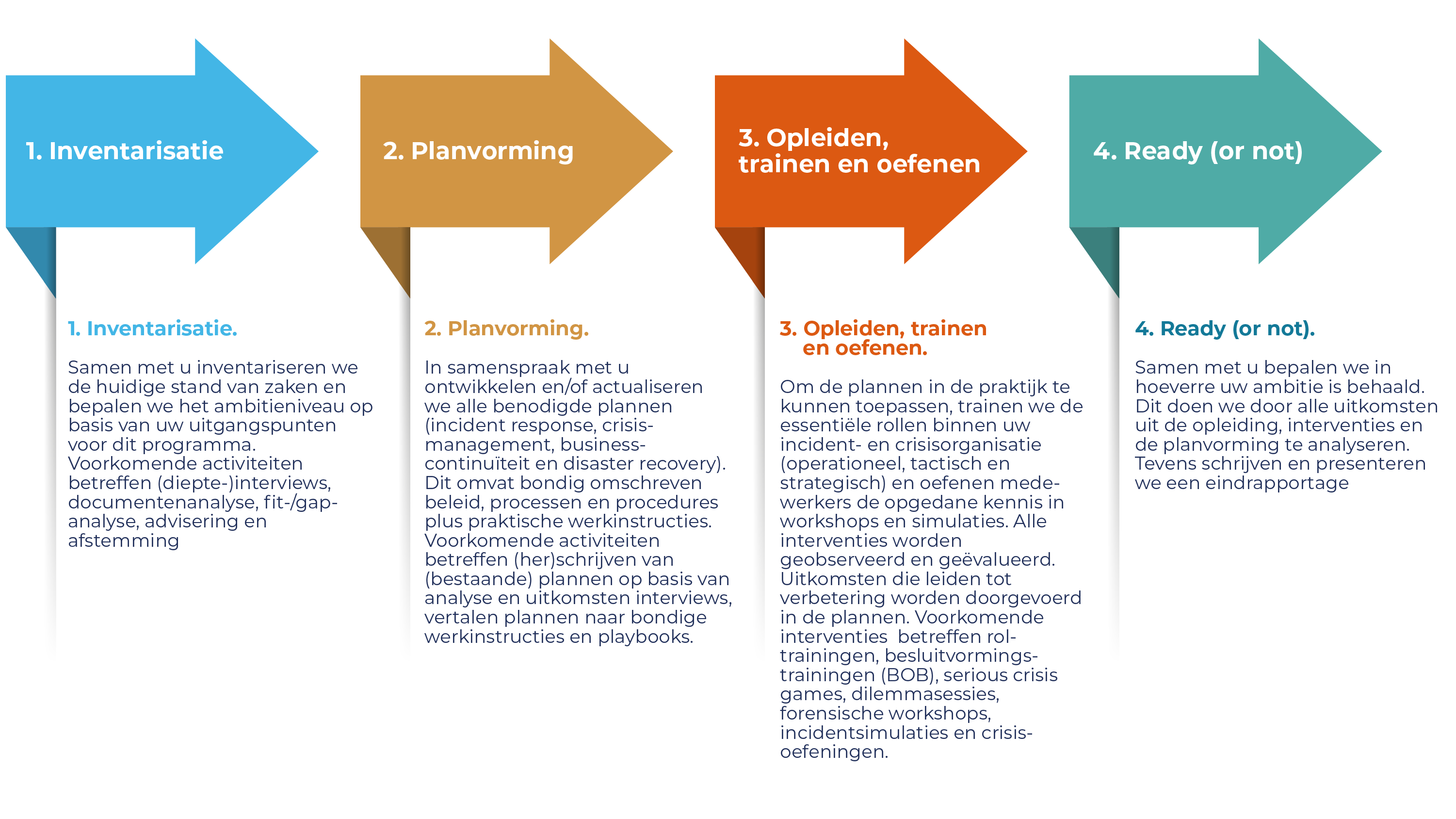 Voor veel organisaties is het een uitdaging om adequaat voorbereid te zijn, tijdig te reageren en de bedrijfscontinuïteit te waarborgen. Het gaat dan bovenal om structuur, cohesie en geïntegreerd werken. In onze aanpak spelen we hierop in door middel van vier bouwblokken. Deze vier bouwstenen vormen tevens het fundament voor de verschillende interventies.